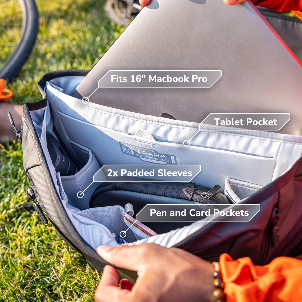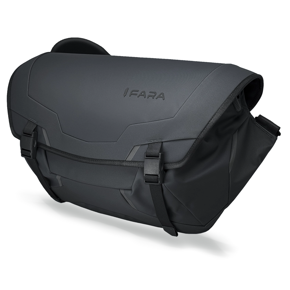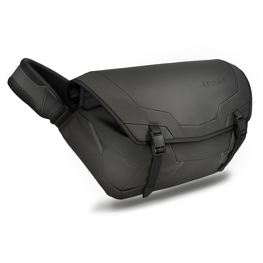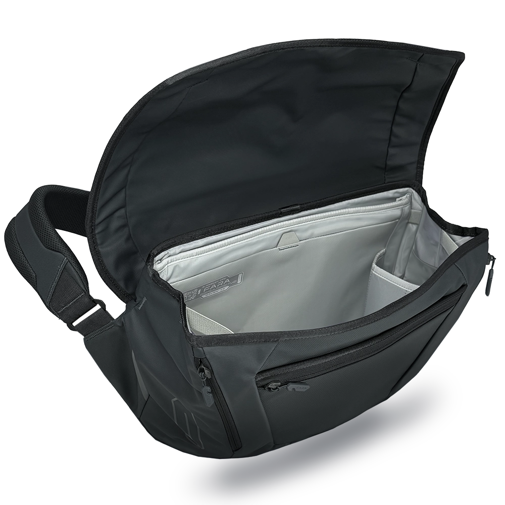 The shoulder strap combines luxe padding, breathable air-mesh, and a structural exoskeleton—bringing advanced backpack ergonomics to a messenger silhouette